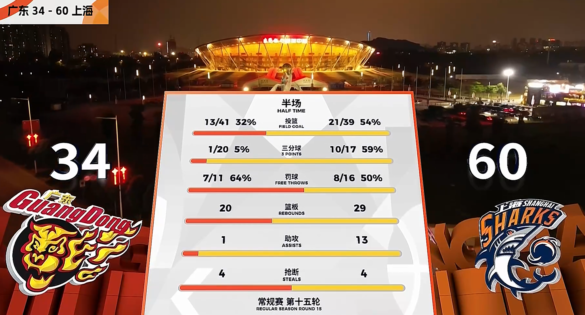 目前,双方上半场比赛已经结束,广东队以34-60落后上海队26分。这样的一个分数,在10分钟一节的比赛,可以说,广东队想要逆转,几乎是不可能的事情。本场比赛,广东队就是输多少分的问题,是20分,还是30分,或是40分……