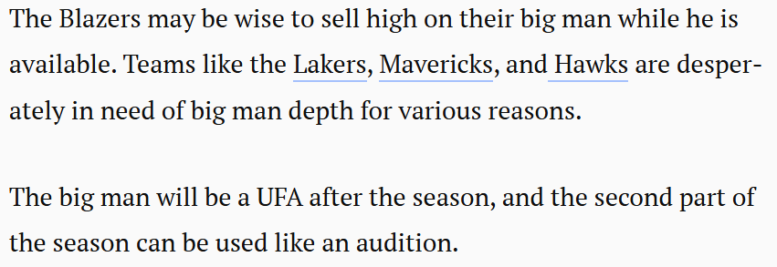 开拓者或许该抓住时机,在威廉姆斯健康且状态火热时将其交易,换取最大价值。湖人、独行侠和老鹰等球队,正因各种原因急需补强内线深度。